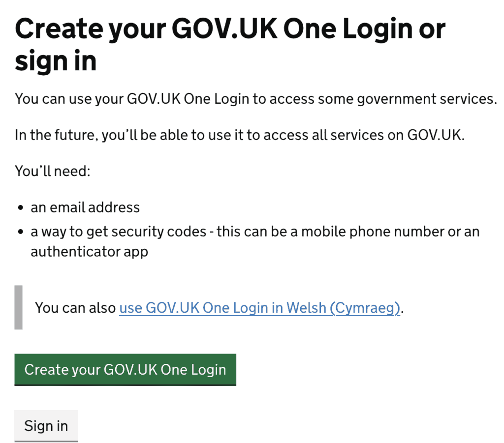 2. On the next page, you will be asked to sign in using your Gov.UK One Login or you can create a login by clicking the green button